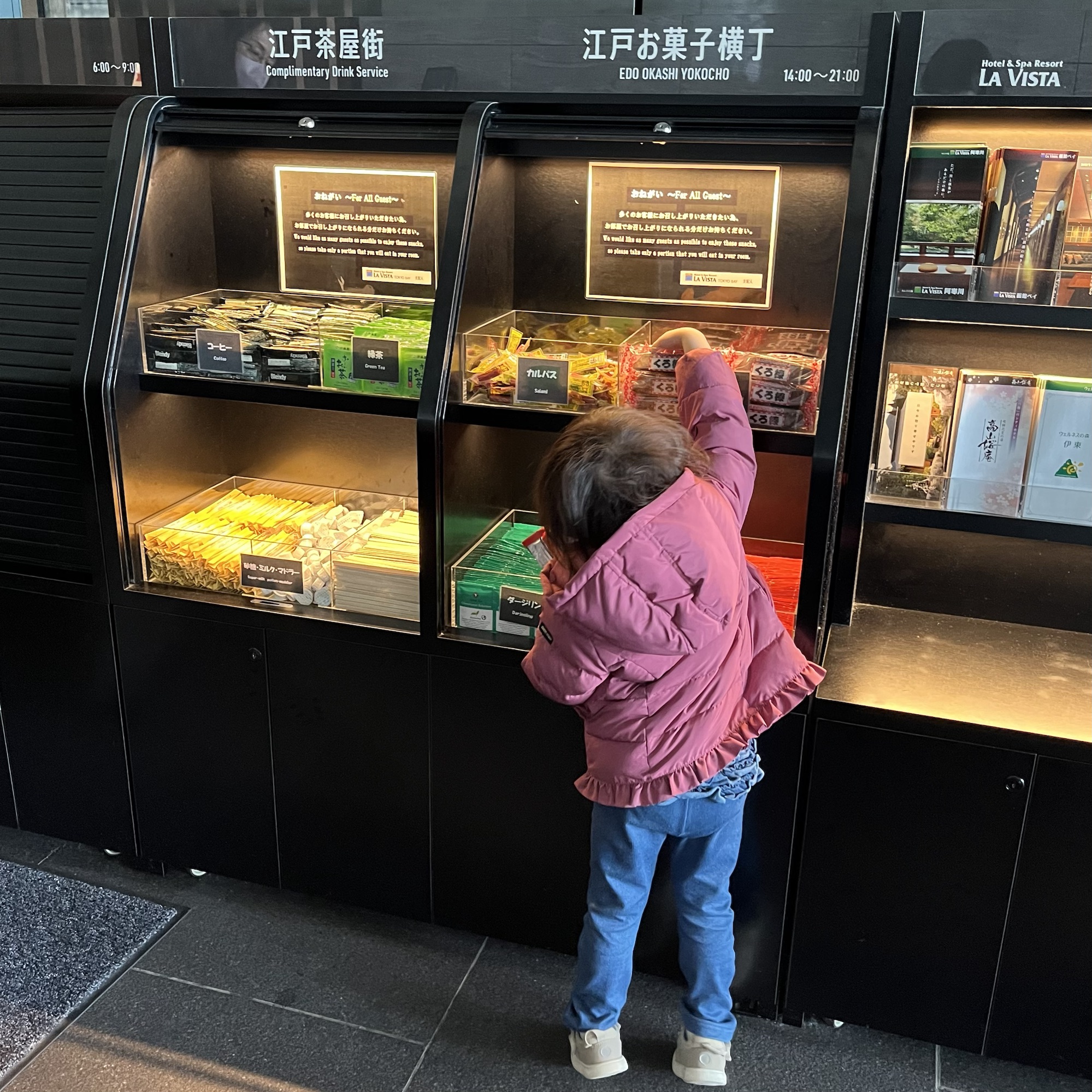 ドーミーインにはないサービスとして、「江戸お菓子横丁」というお菓子を自由に選べるコーナーがあります。